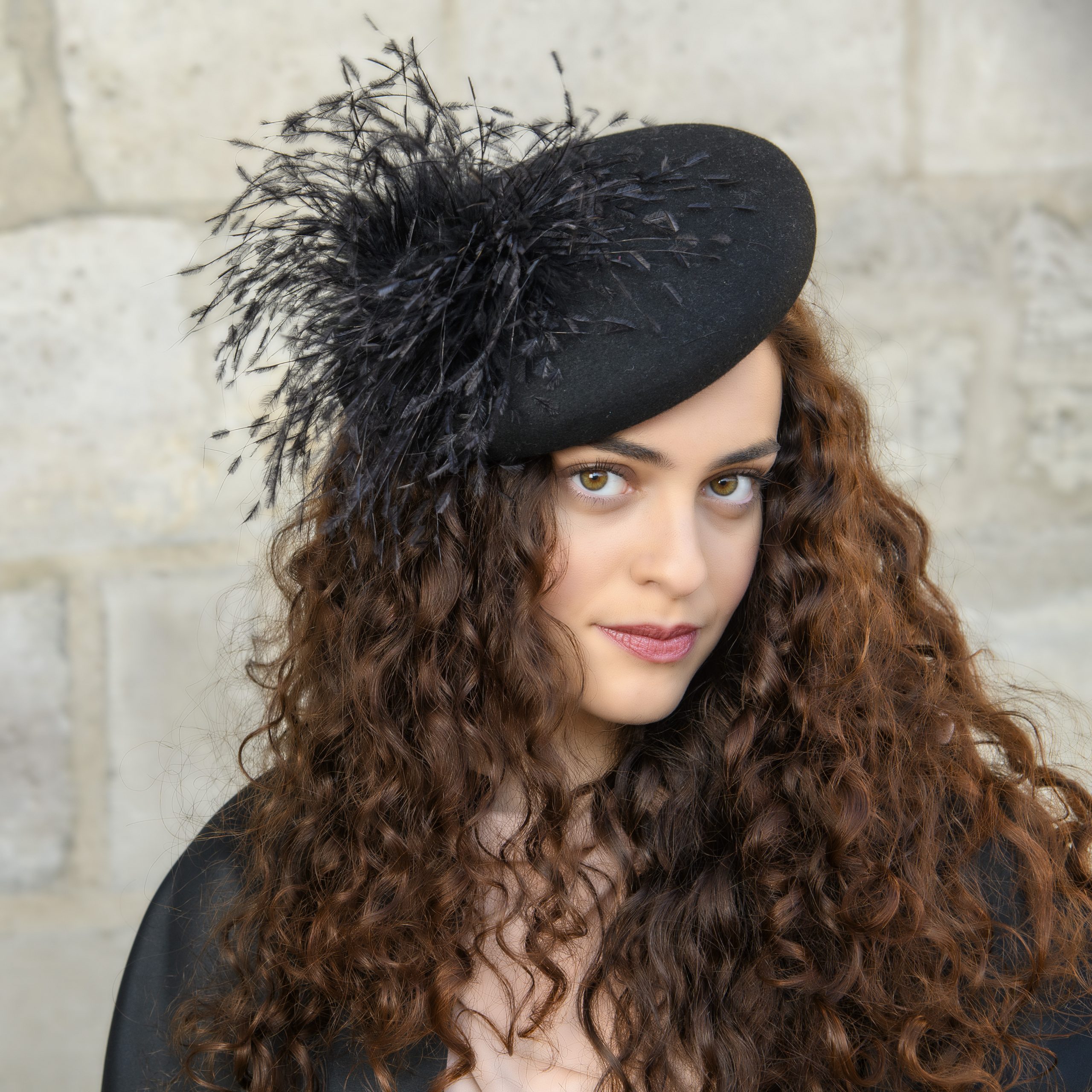 Bibi en feutre noir et plumes d’autruche, finition élastique noir.