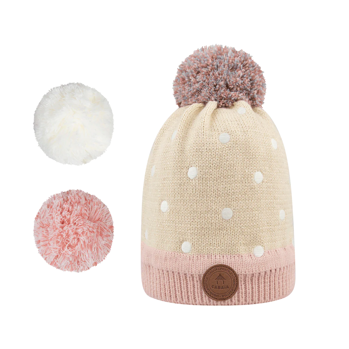 Le bonnet enfant avec ses 3 pompons interchangeables grâce à un aimant, pour assortir votre bonnet à toutes vos tenues et à votre humeur.