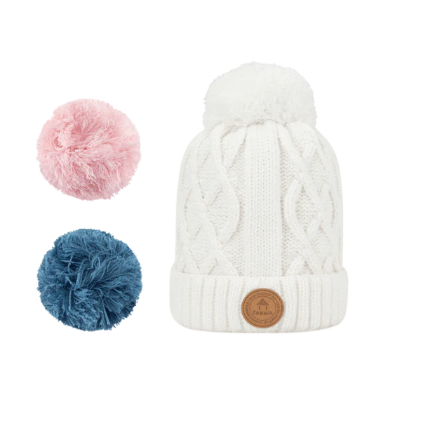 Le bonnet bébé avec ses 3 pompons interchangeables grâce à un aimant.