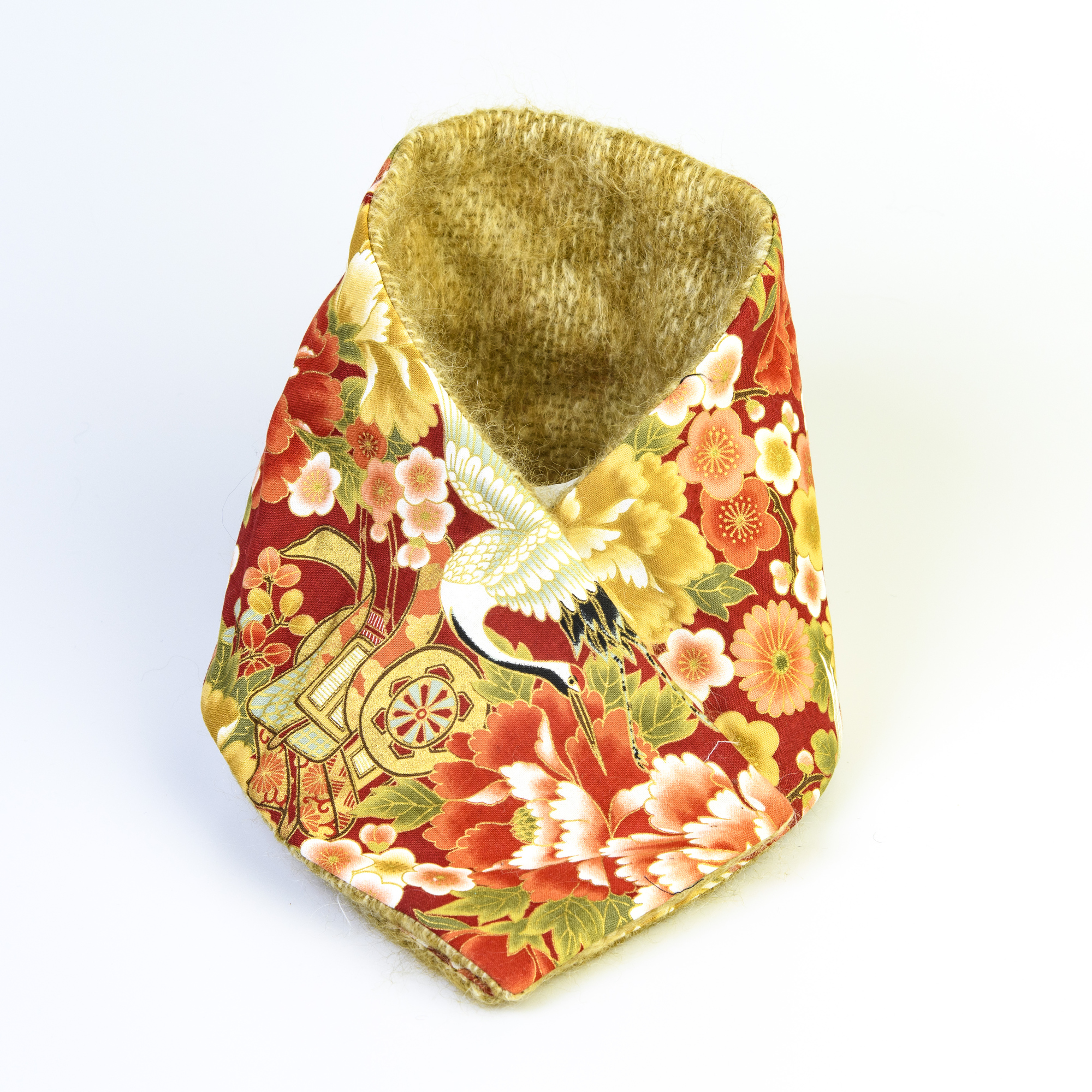 Echarpe col en coton du japon à motif fleurs et mohair ocre, réversible. Fermeture pression. Fabriqué en France.
