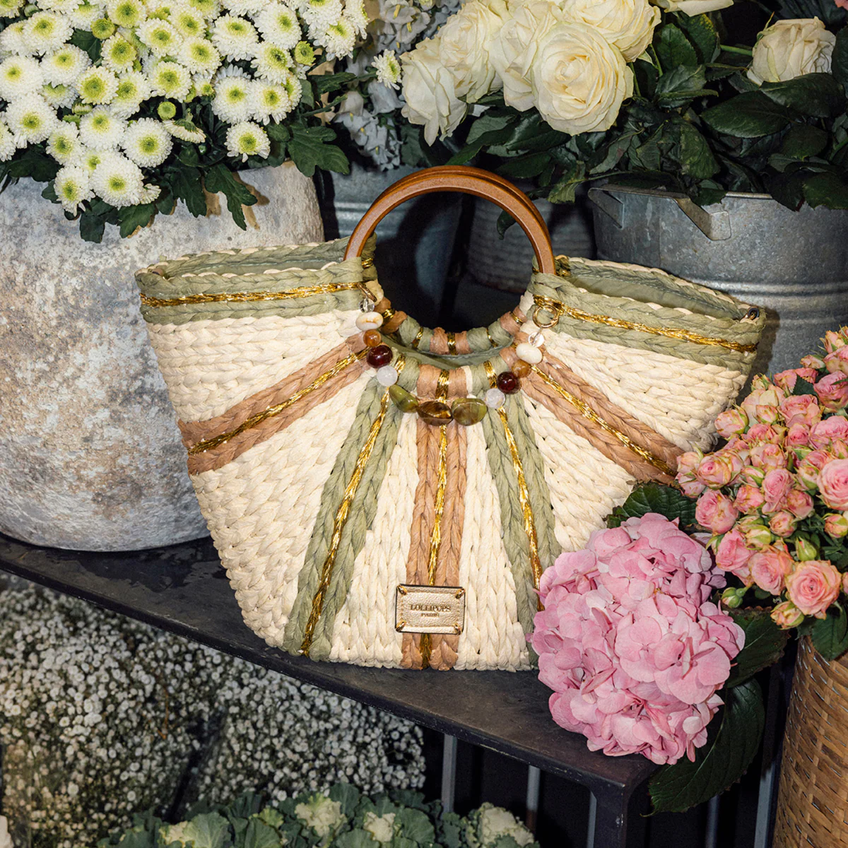 - Grand panier en paille kaki avec détails dorés