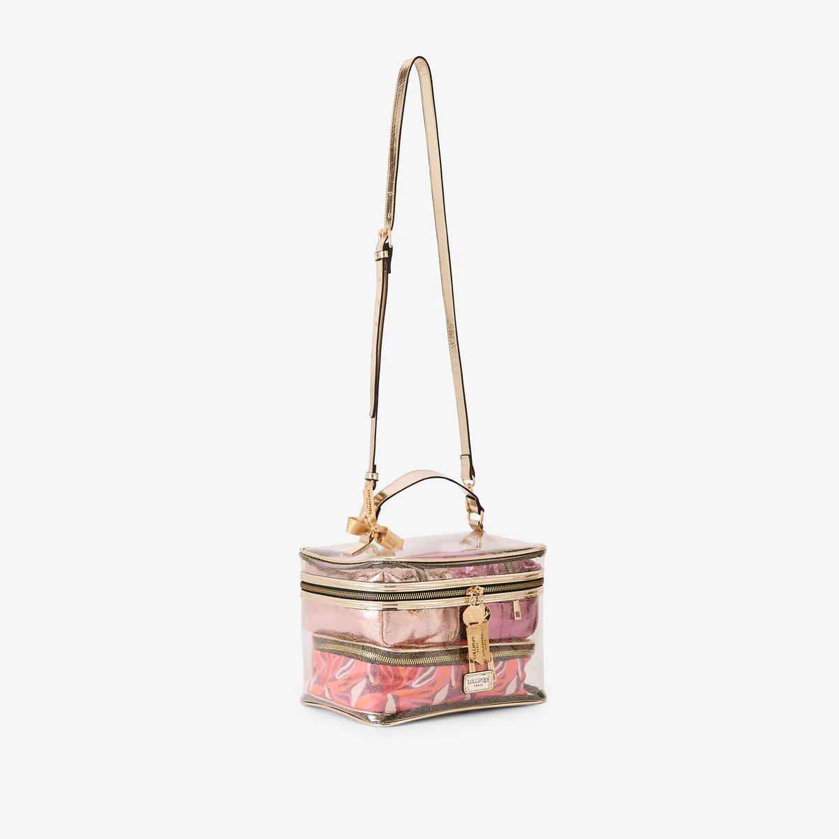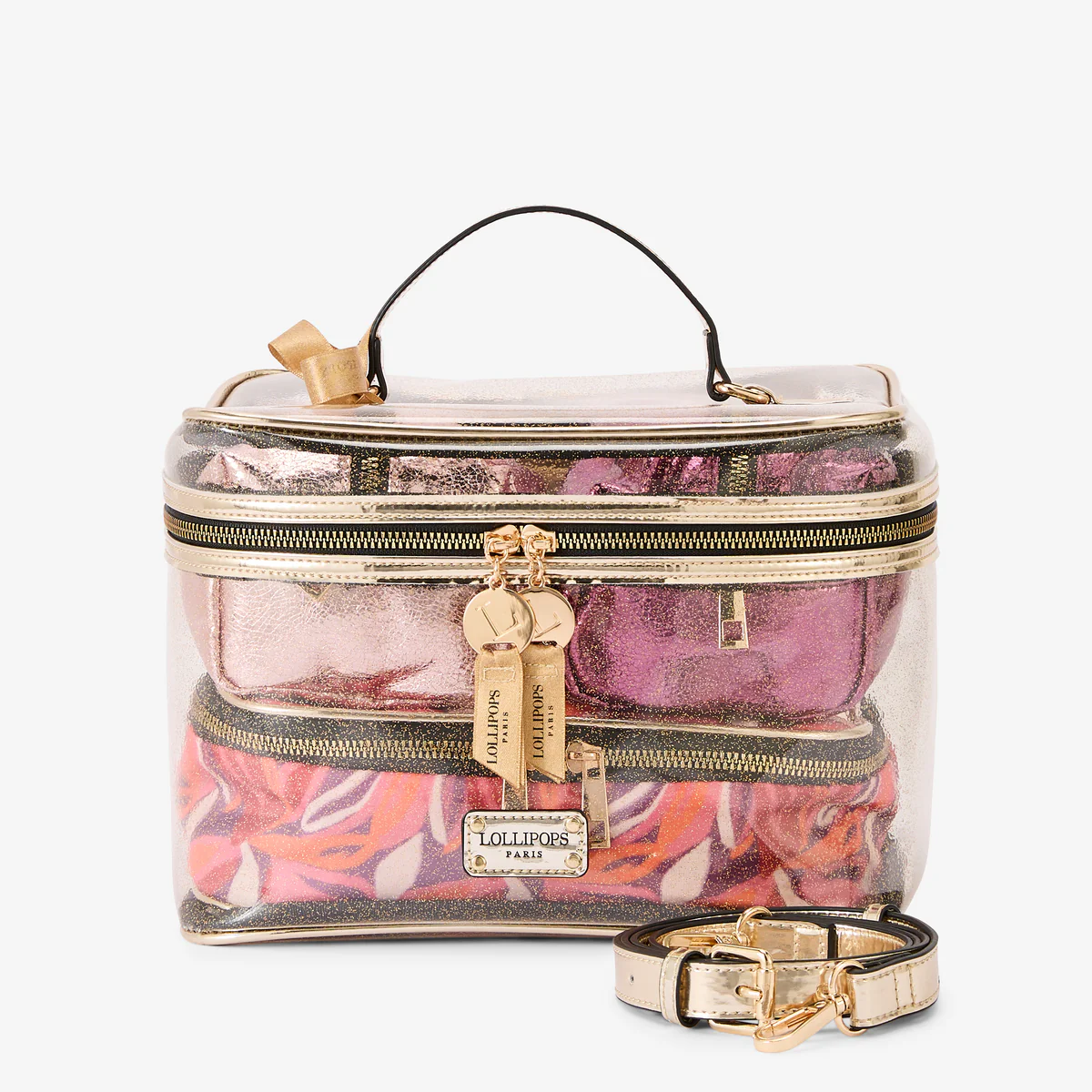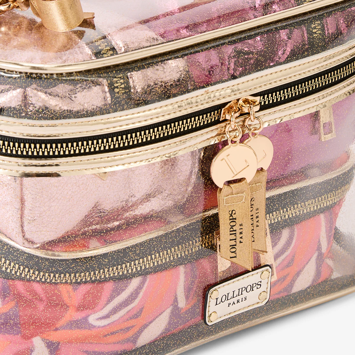 - Grand vanity transparent à paillettes avec finitions dorées et trousses