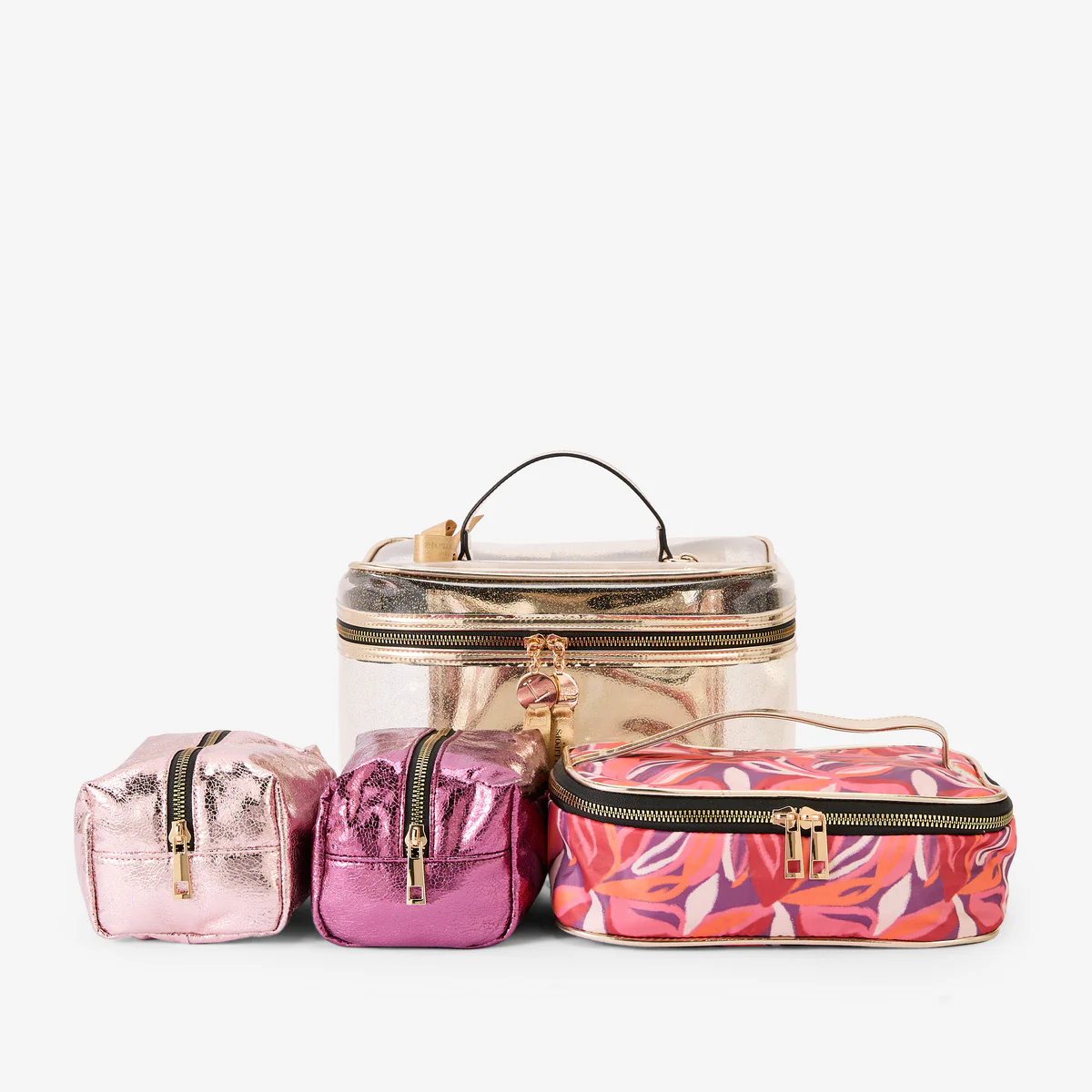 - Une trousse métallisée en simili cuir grainé rose