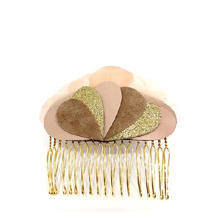 Peigne petit modèle en plumes coquille d’oie nude et cuir marron, rose et doré