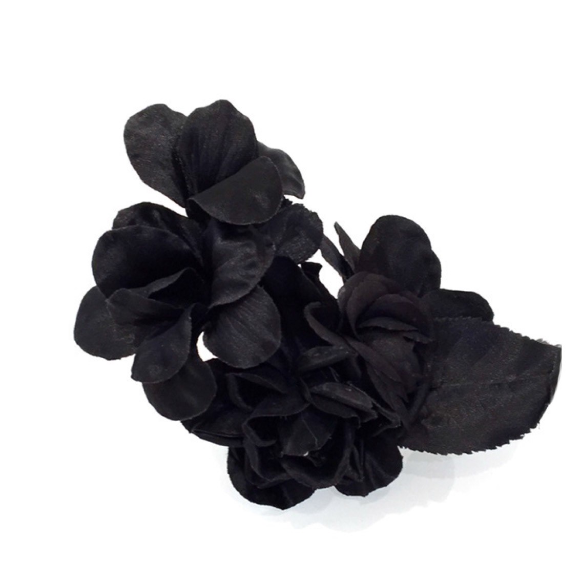 Composé de feuilles et fleurs en satin noir. Finition pince.