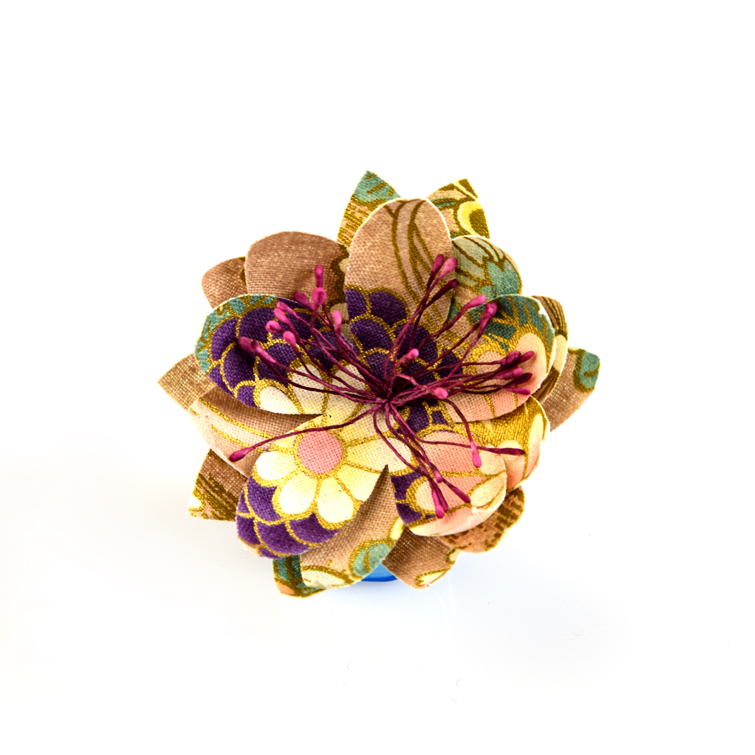 Broche en coton du Japon à fleurs tricolore or rose et violet. Fabriqué en France.