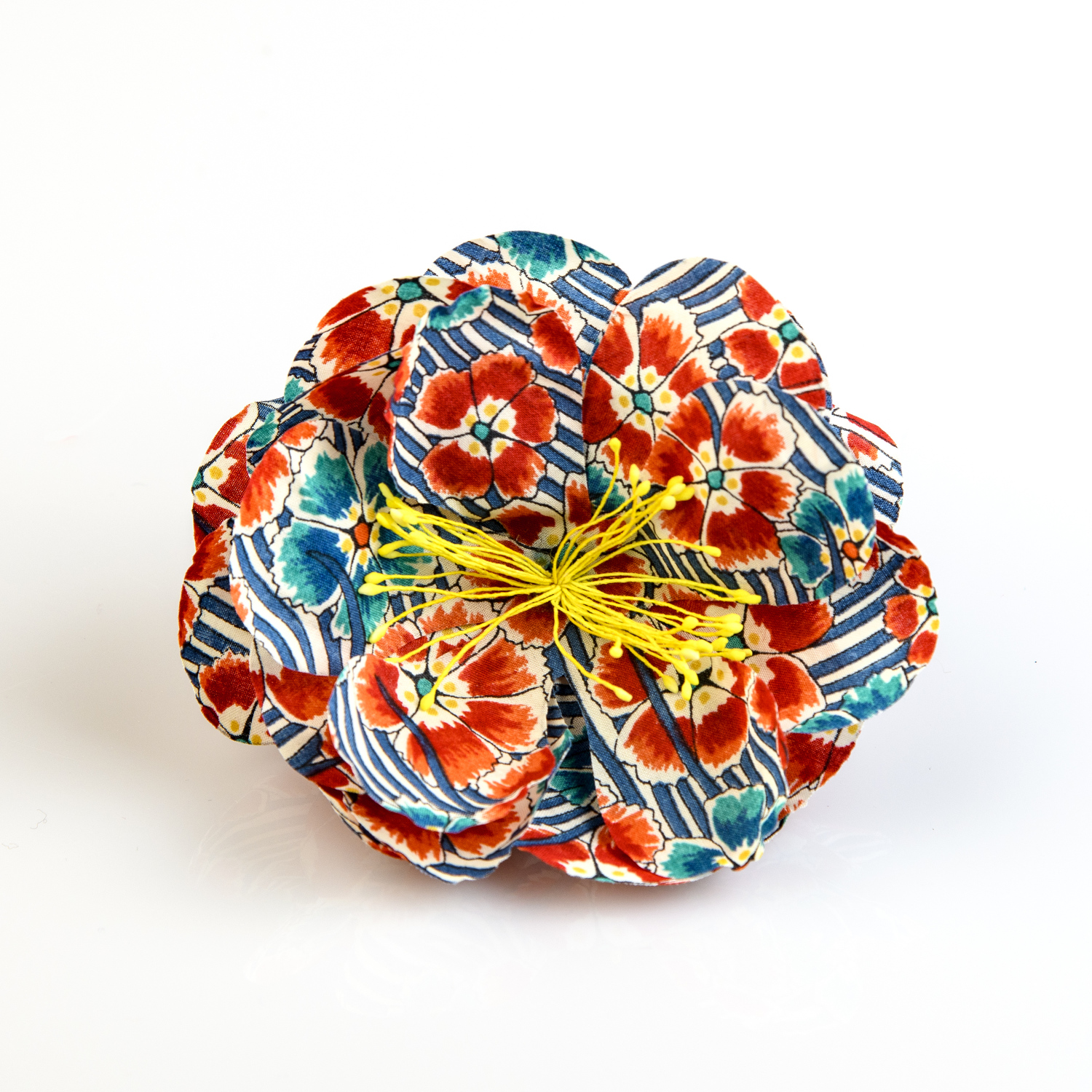 Broche en liberty à fleurs bleues et rouges. Fabriqué en France.
