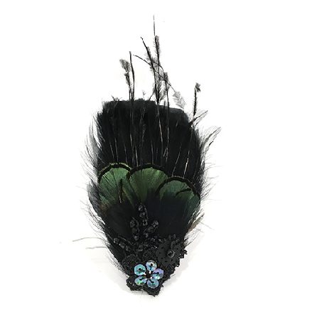 Pince petit modèle en plumes de queue de coq noires, plumes d’autruches brulées, dentelle noire, paillettes et perles de verres.