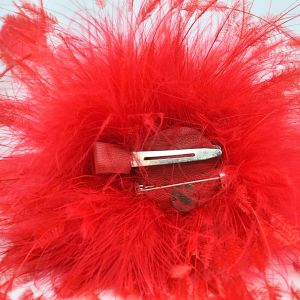 Pince-broche rouge, plumes d’autruche brulées. Fait mains à Paris.