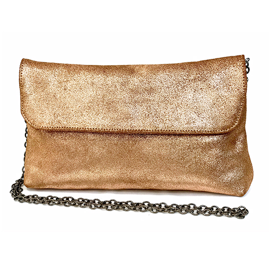 Pochette en cuir croute de porc champagne, doublé coton et finition chaine