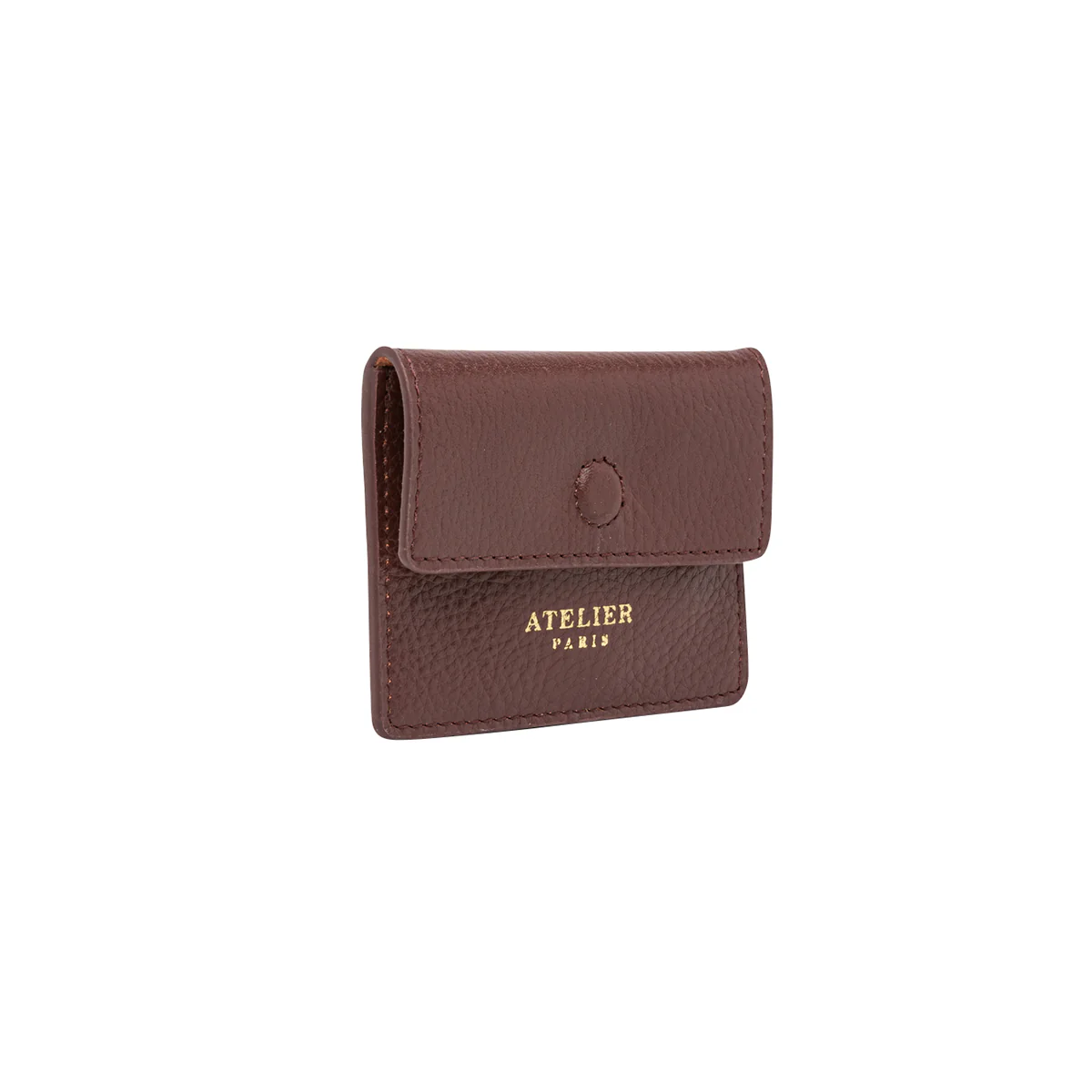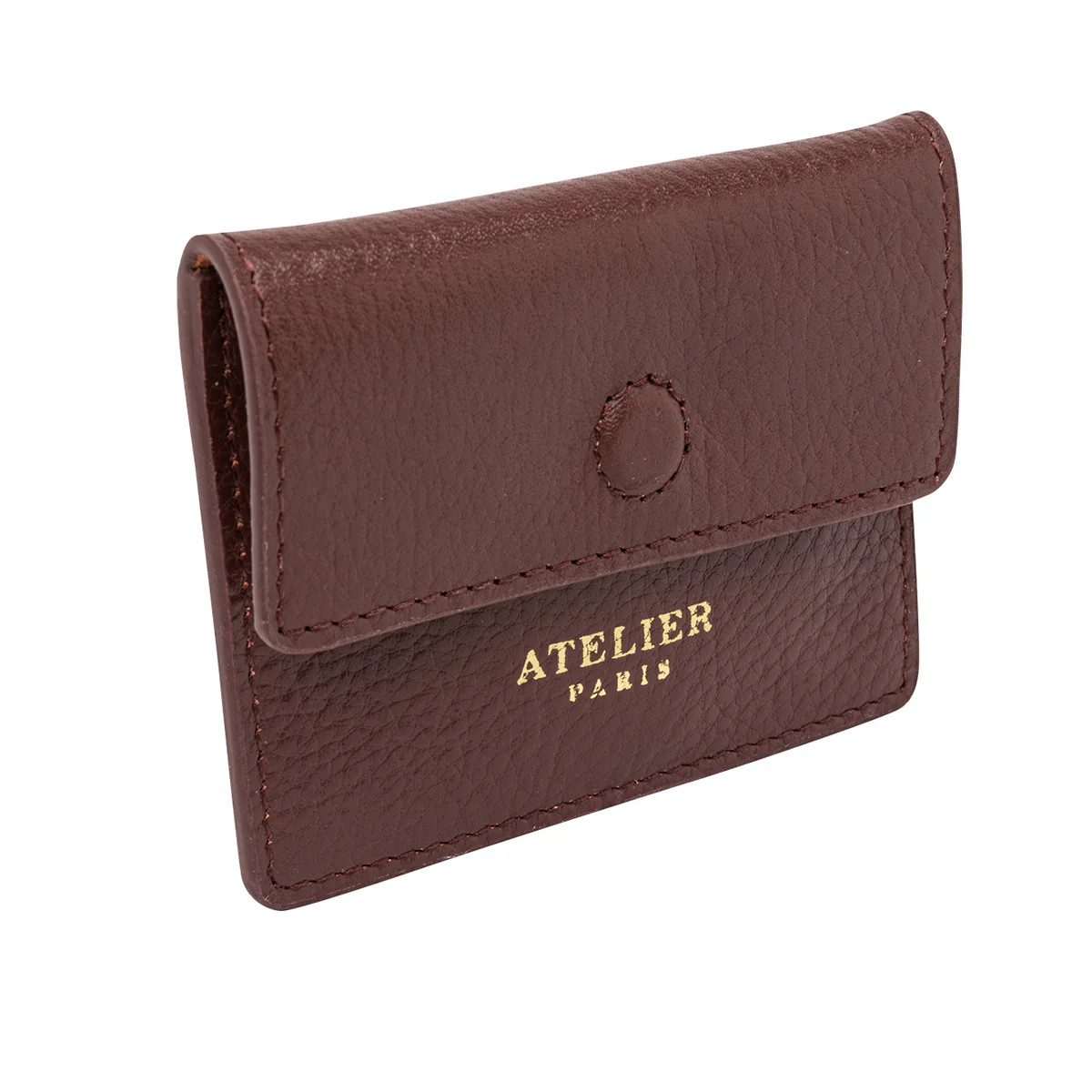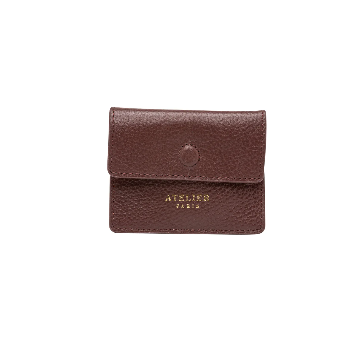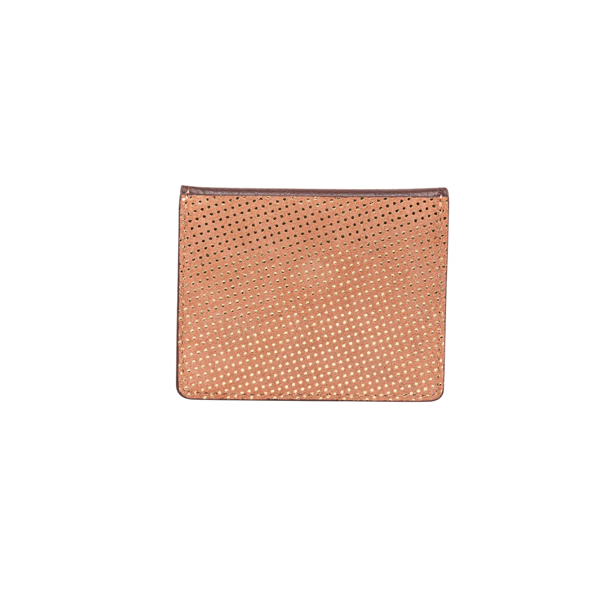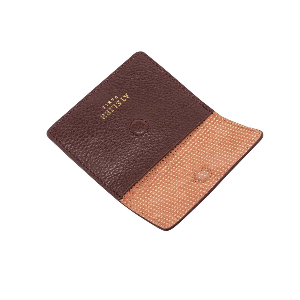 Porte-cartes en cuir lisse bordeaux eten suede rose irisé à petits pois dorés.