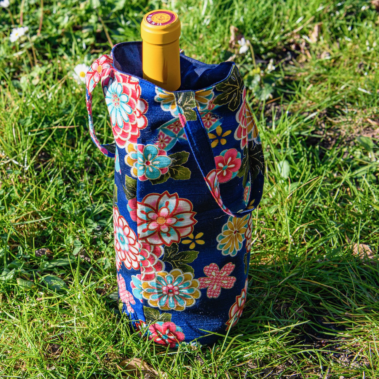 sac à bouteille en coton du Japon vert à fleurs, anses en cuir. Fabriqué en France. Un savoir-faire français