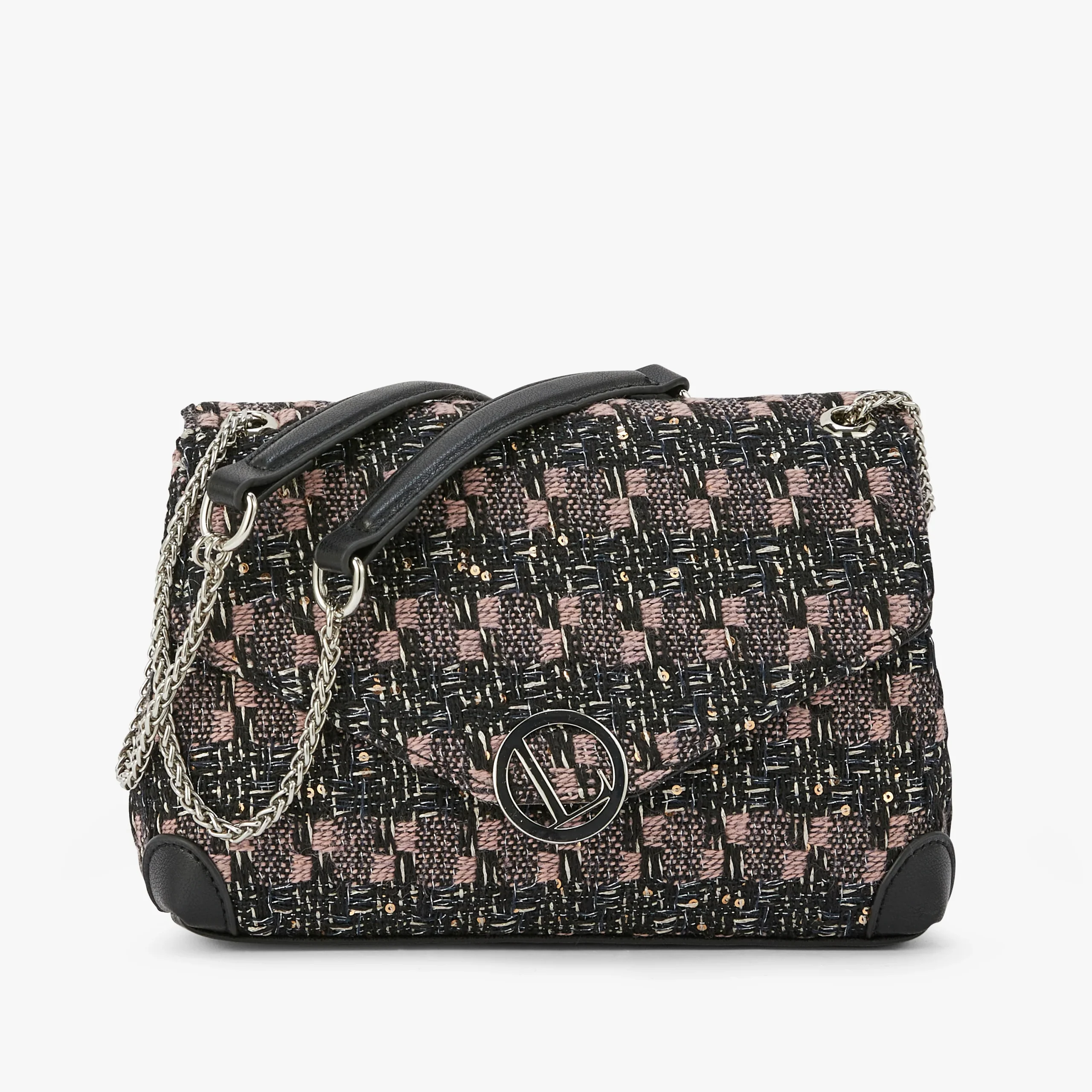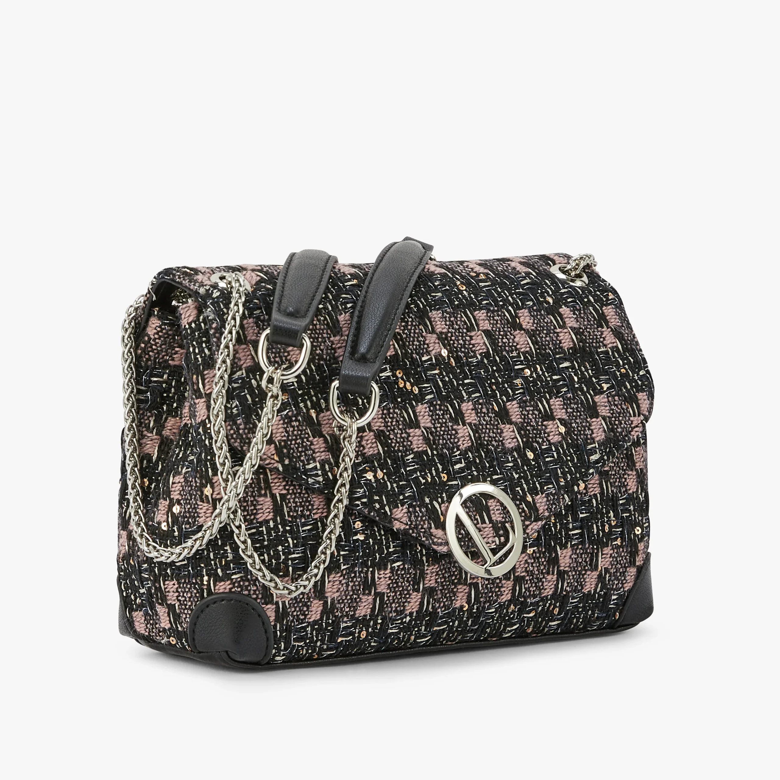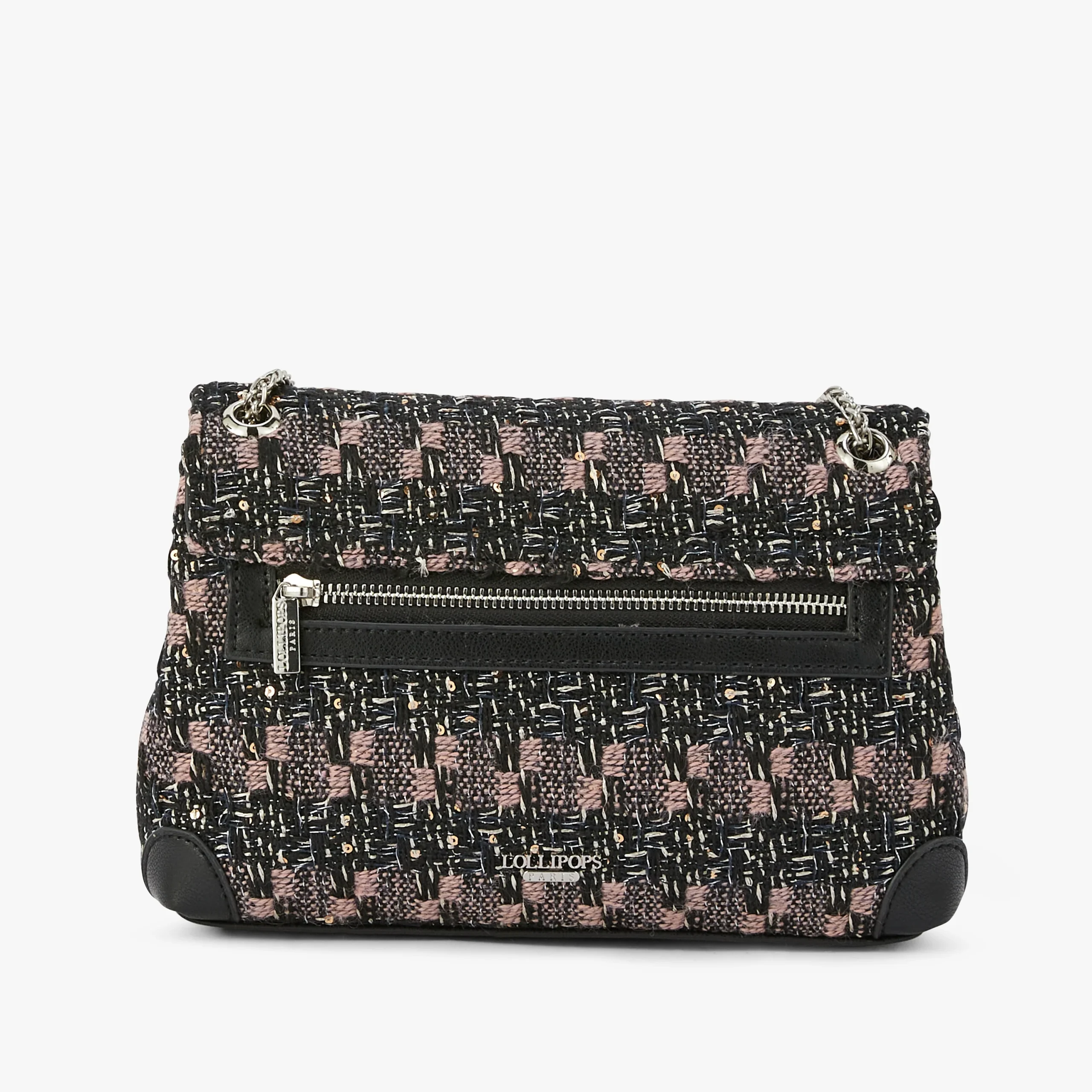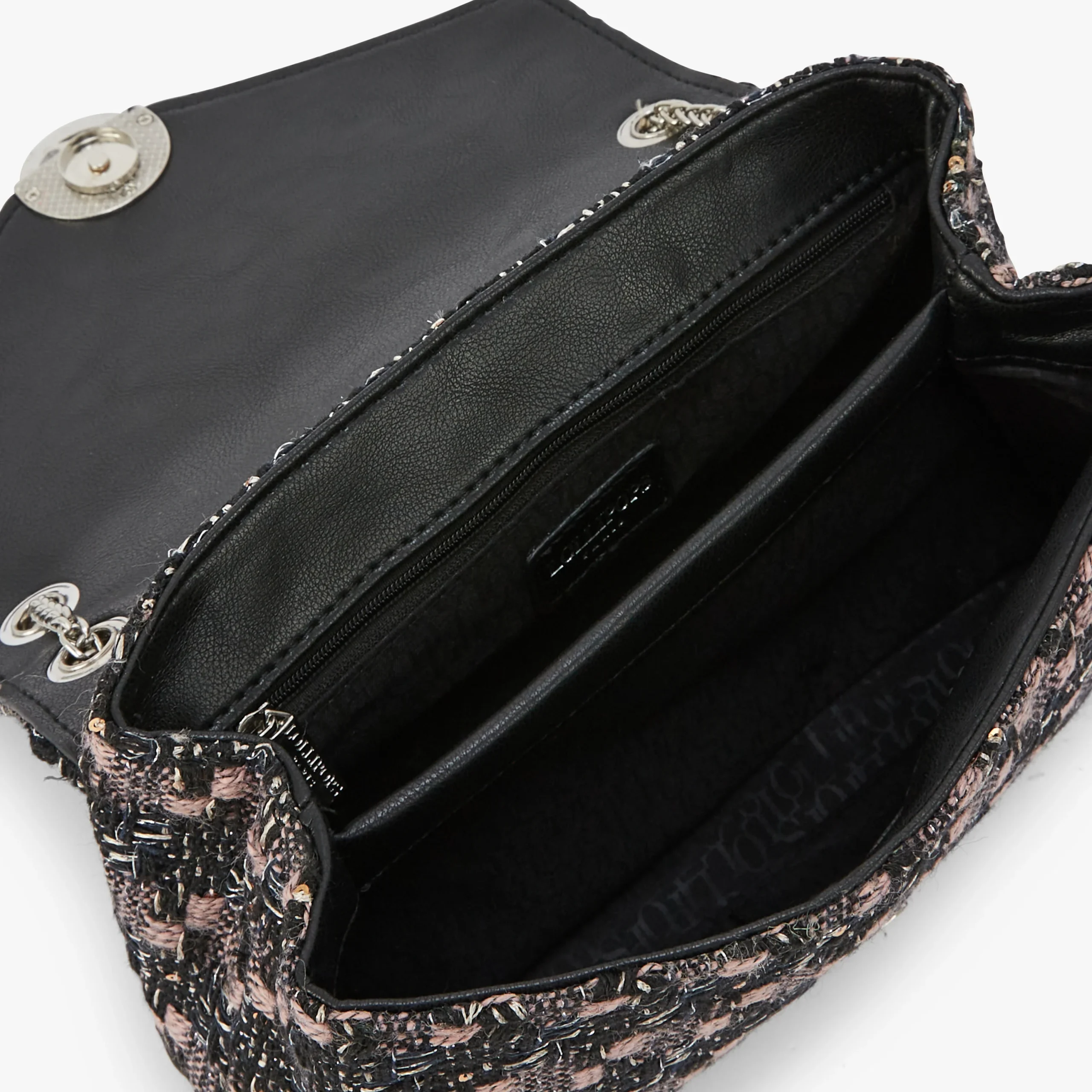 - Sac en textile effet tweed rose et noir, décoré de fils brillants argentés et sequins dorés
