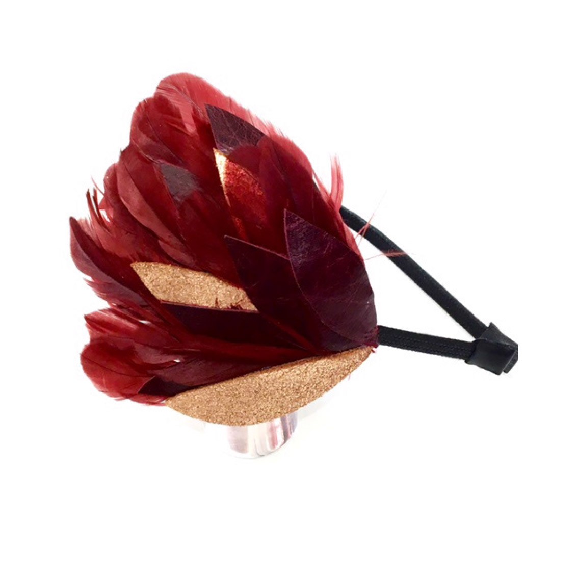 Composé principalement de plumes de queue de coq bordeaux, de feuilles de cuir bordeaux et champagne Finition serre-tête.