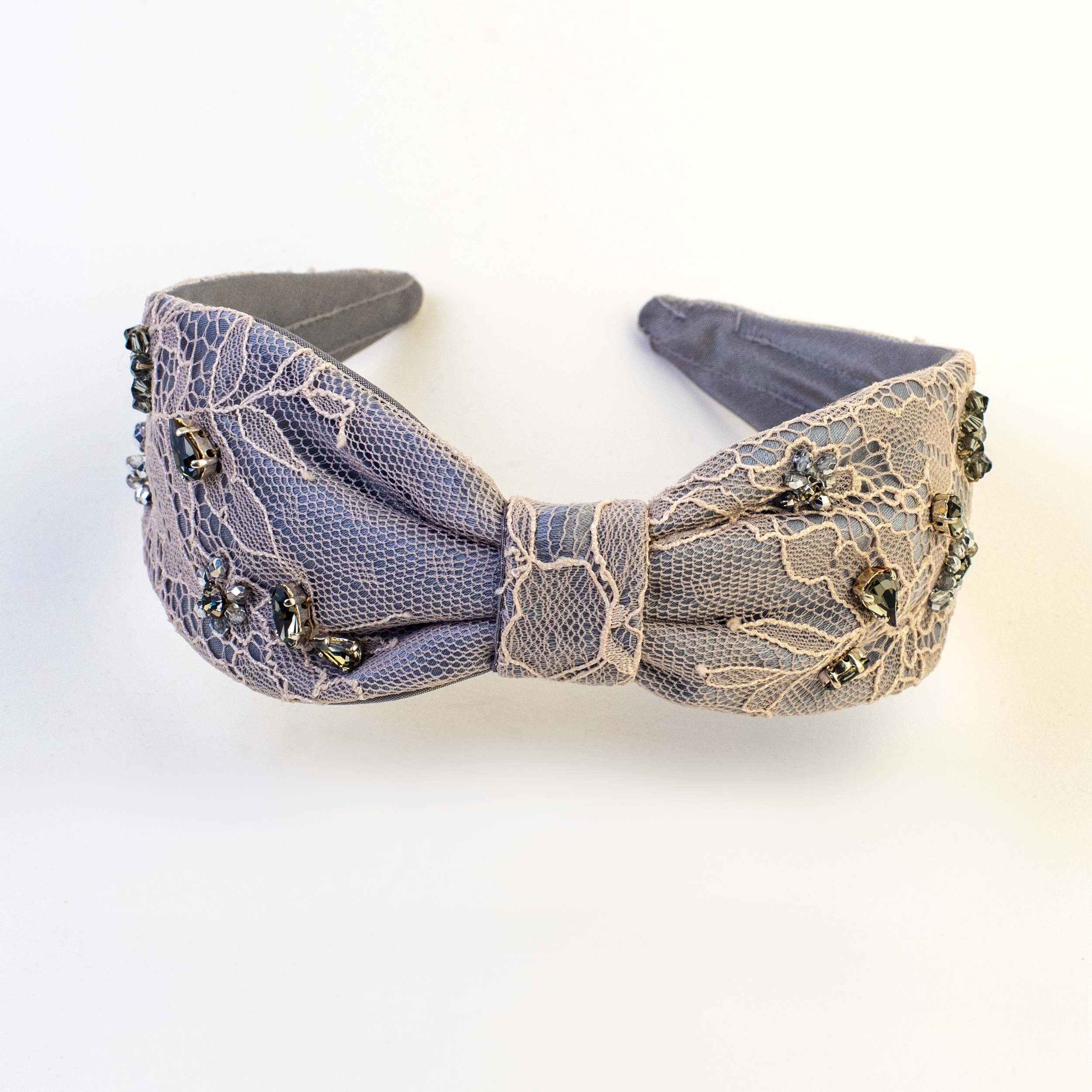 Serre-tête fin satin dentelle broderie grège abricot. Fabriqué en France. Un savoir-faire français
