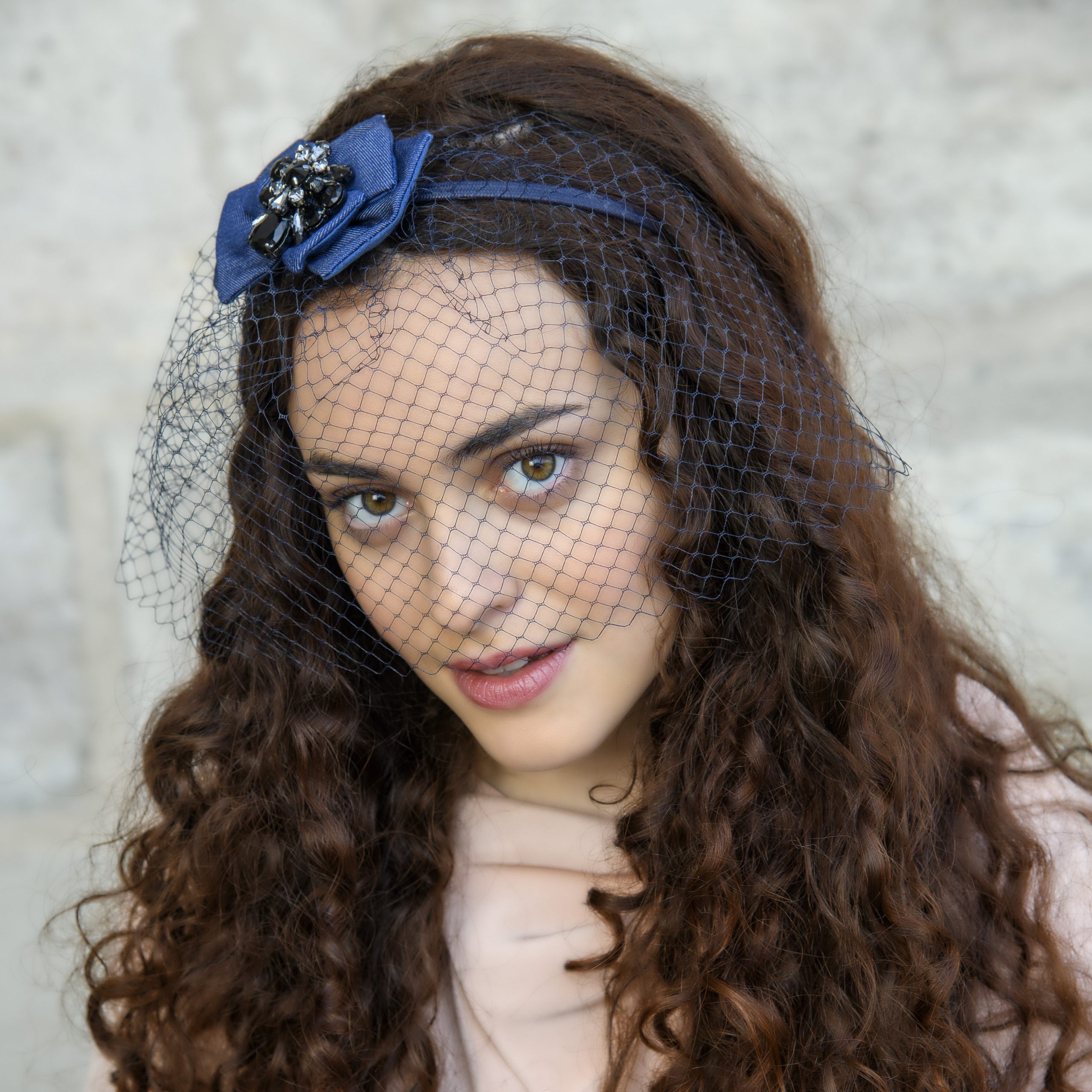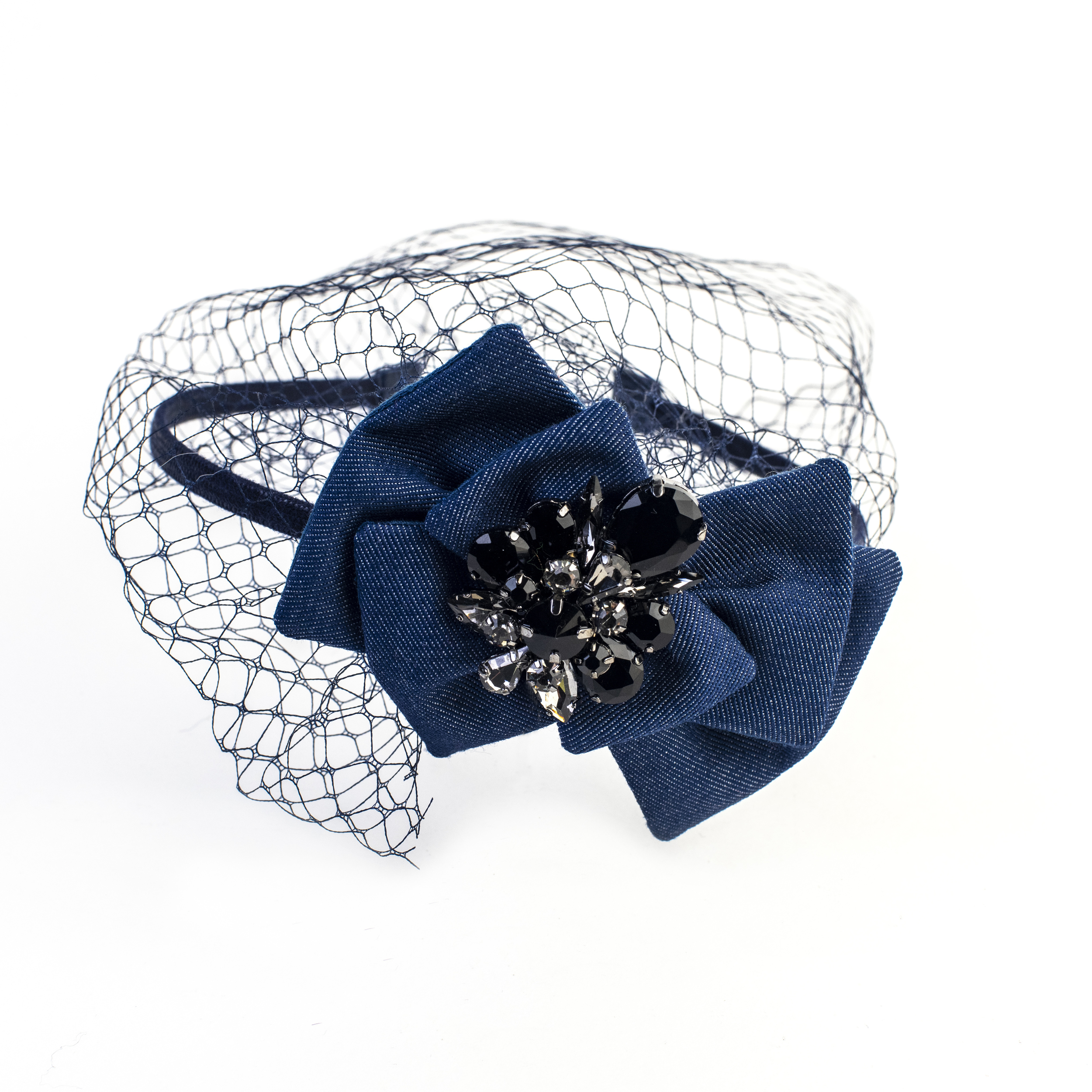Serre-tête en denim bleu foncé, voilette et strass. Made in France. Fabriqué à Paris