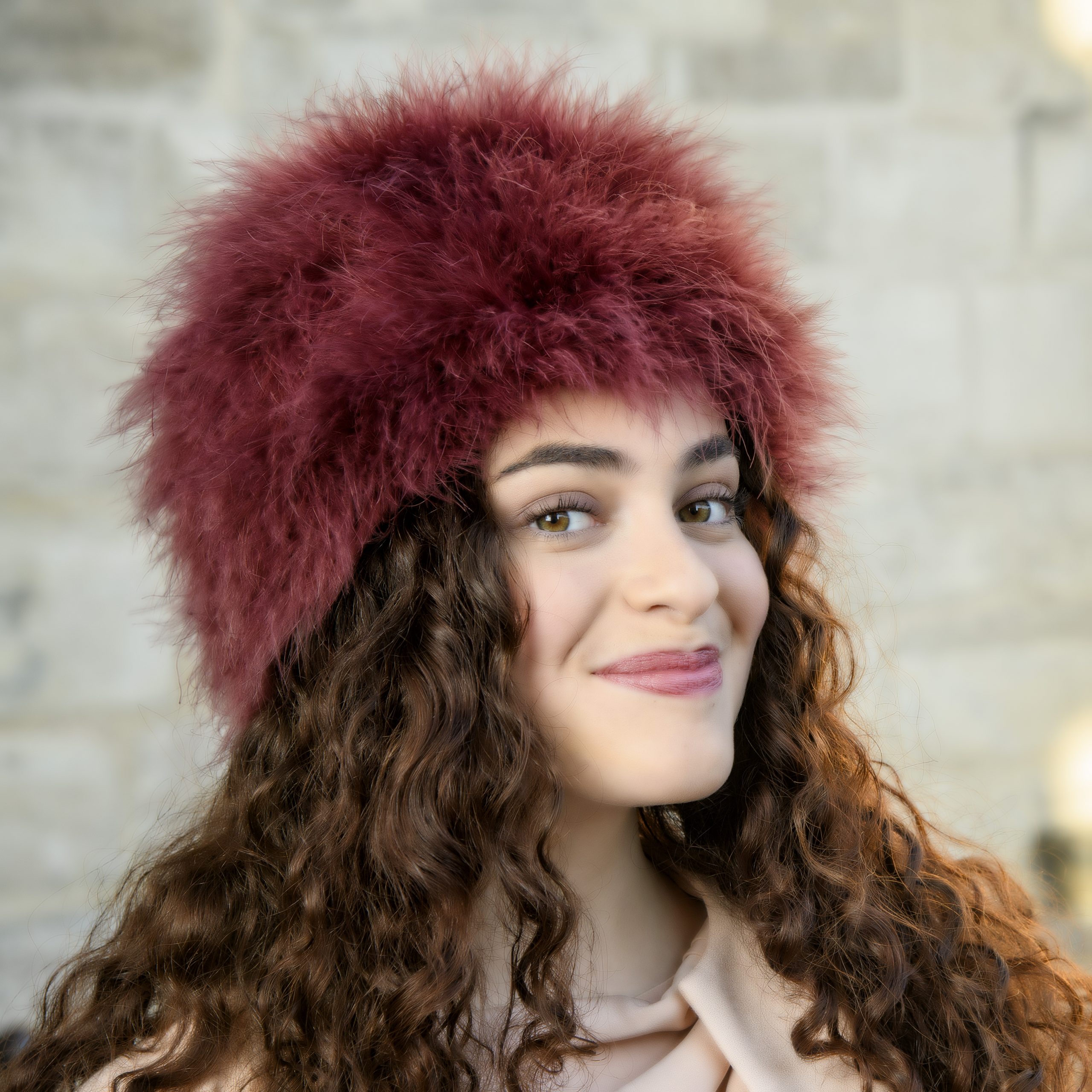 Toque rouge plumes d’oie. Disponible dans d’autres coloris.