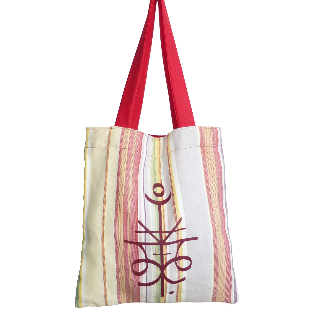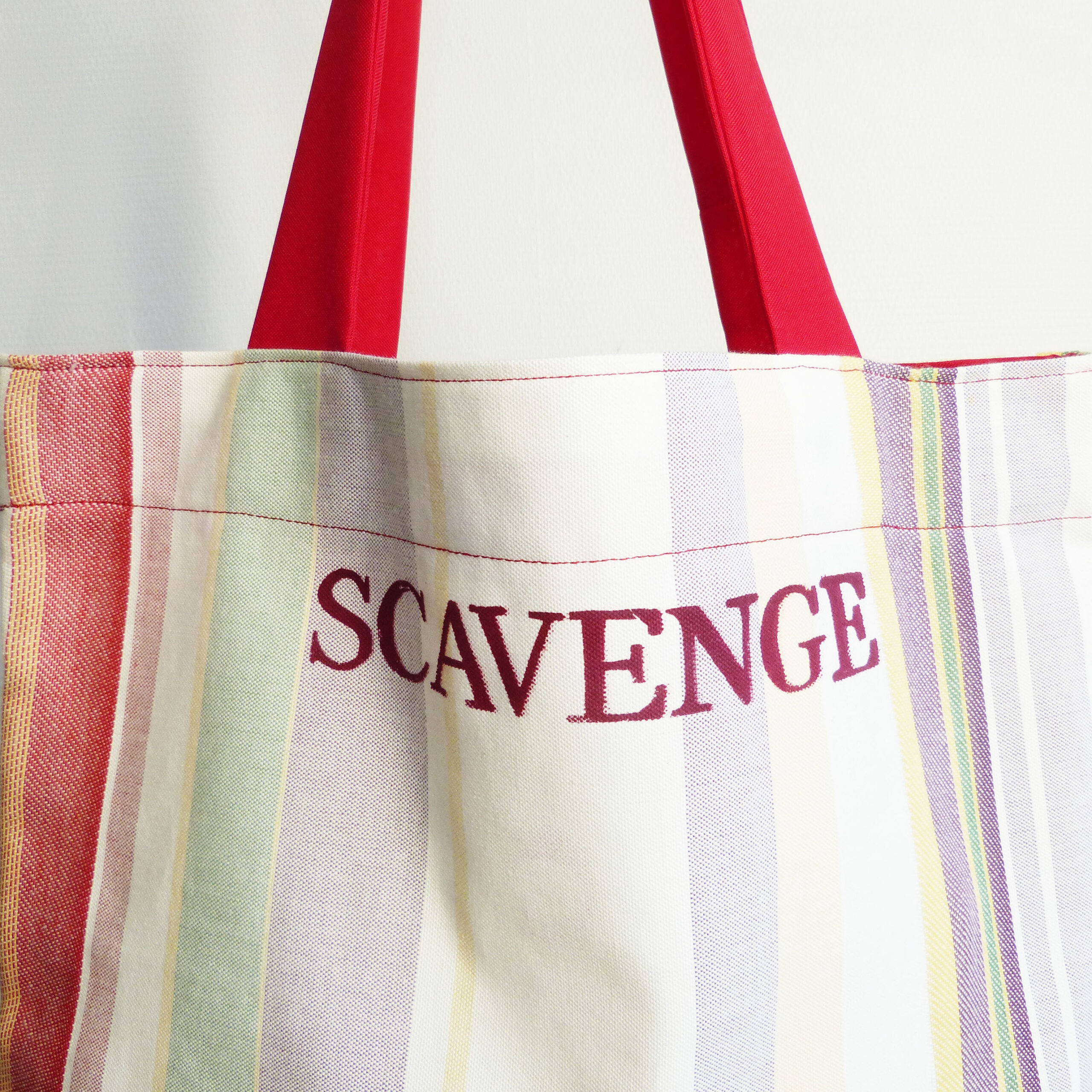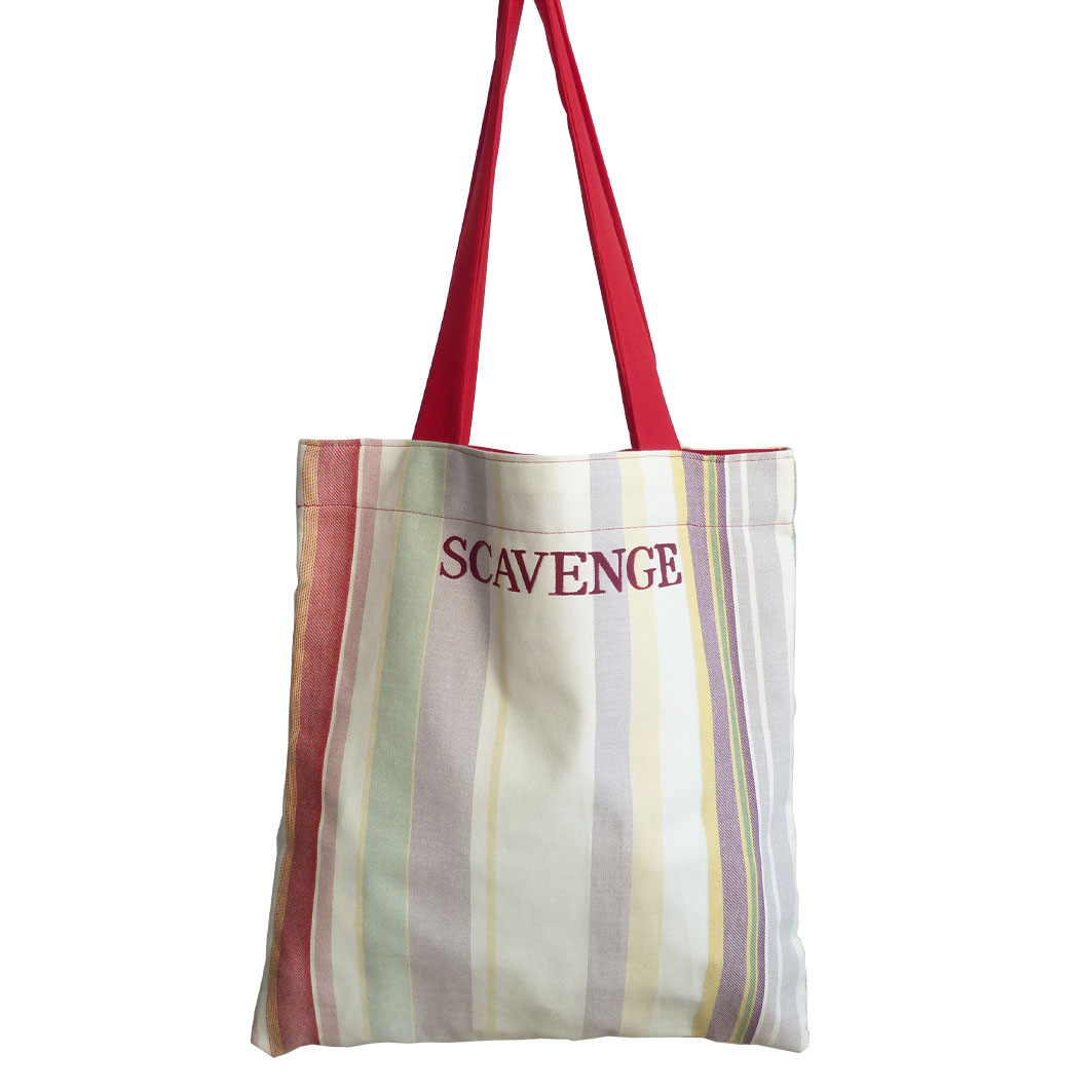 Tote-Bag en tissu recyclé , motifs rayures rouges et multicolores .