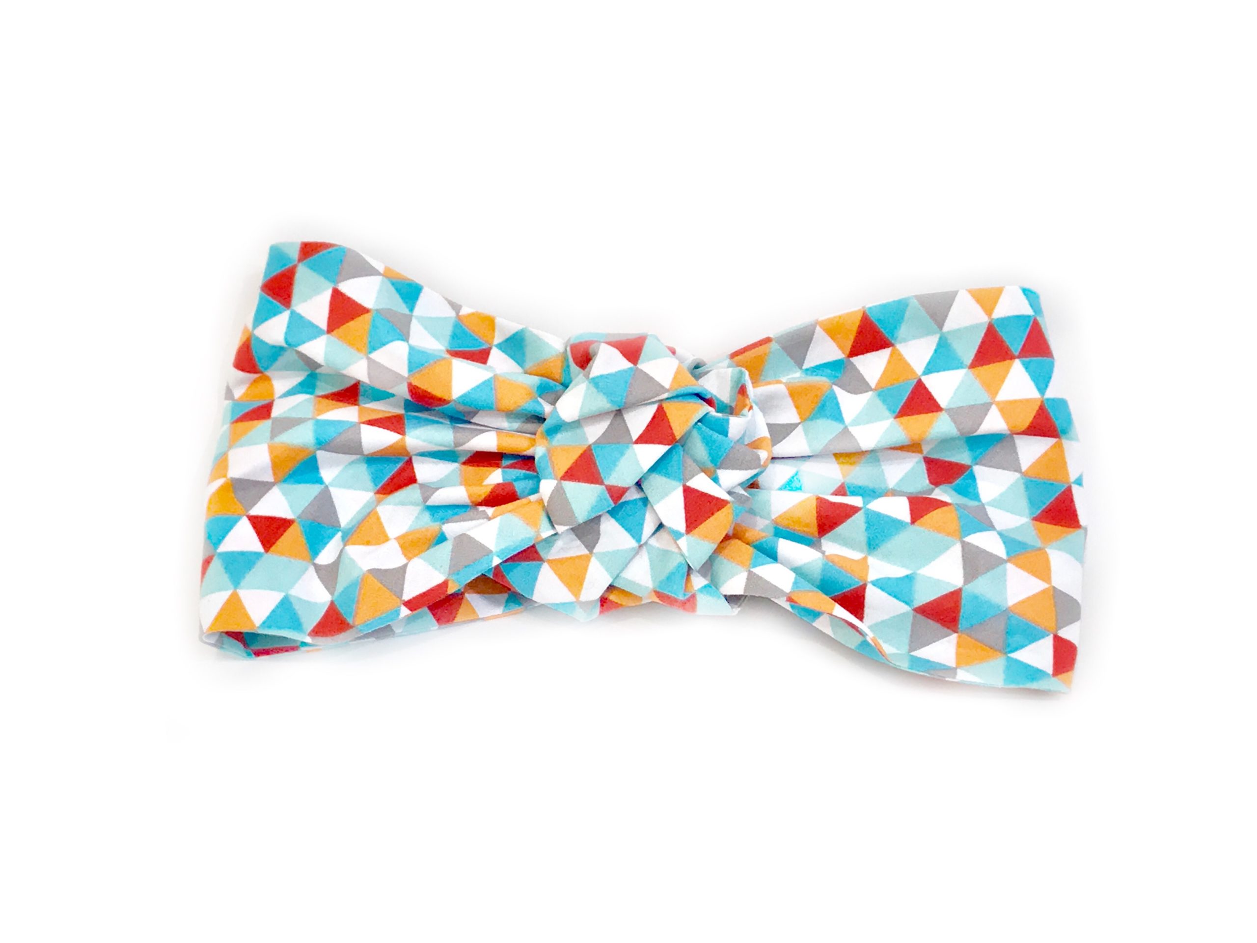 Turban en coton imprimé géométrique orange et bleu.