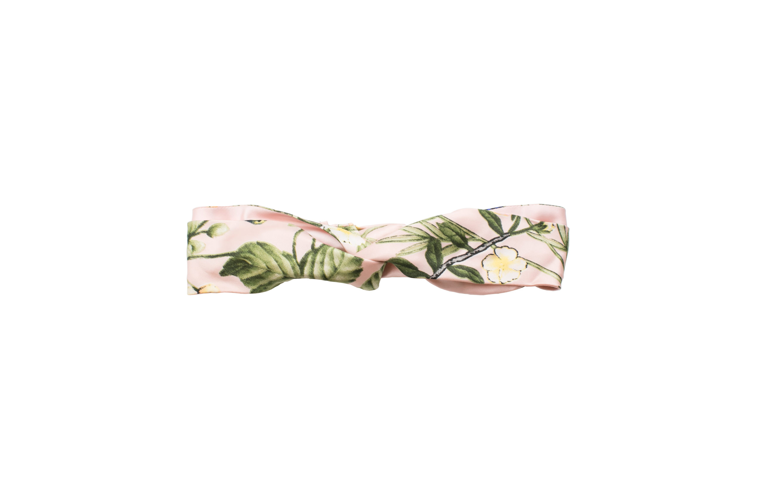 Turban rose clair avec un motif floral en vert, blanc, et jaune.