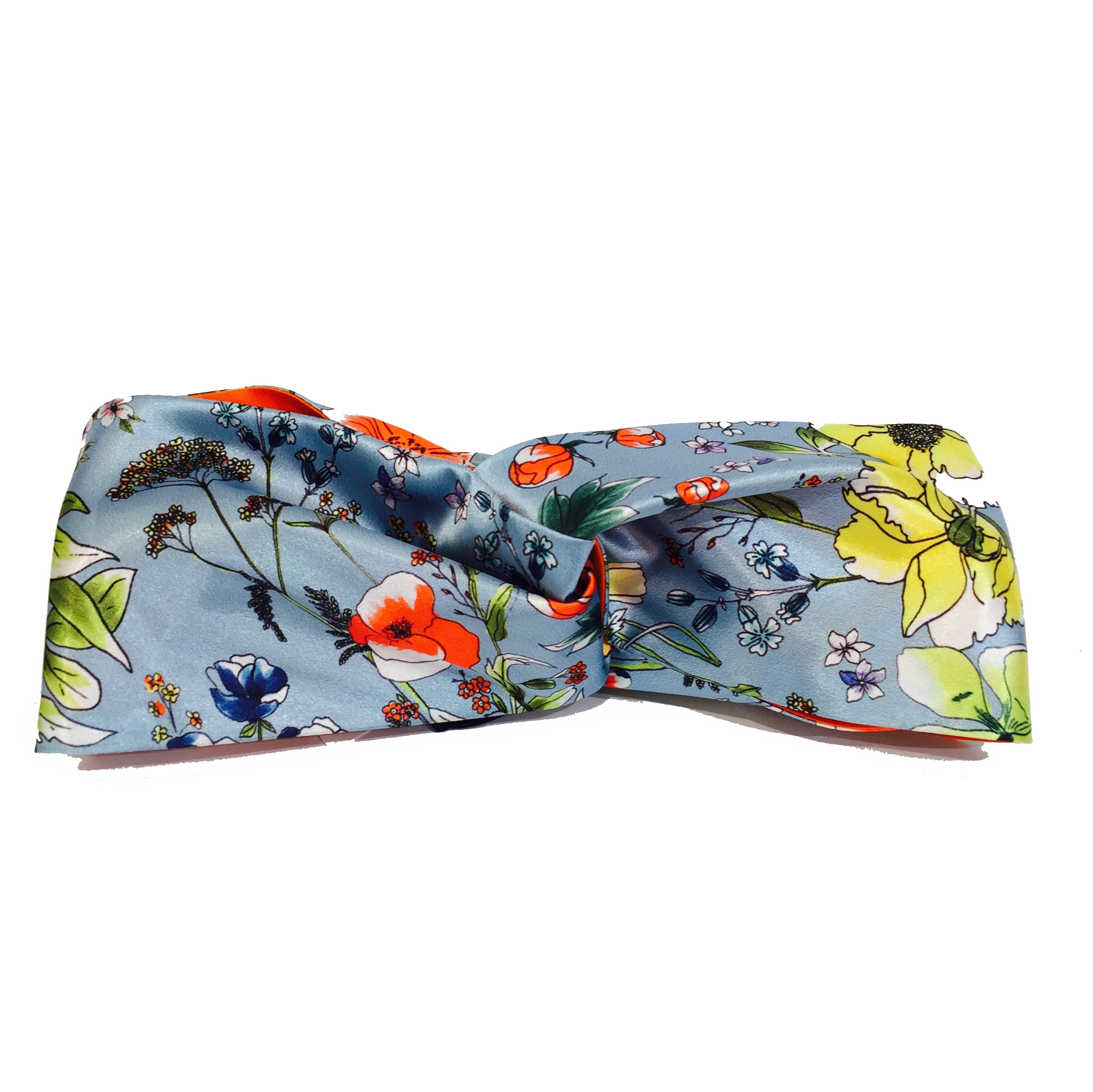Turban tissu satin polyester, doublure coton, bleu fleuri.